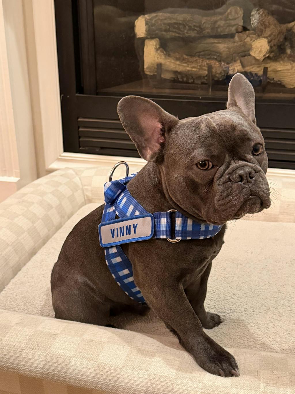 My English bulldog Birdie loves her new harness and special personalized name tag!